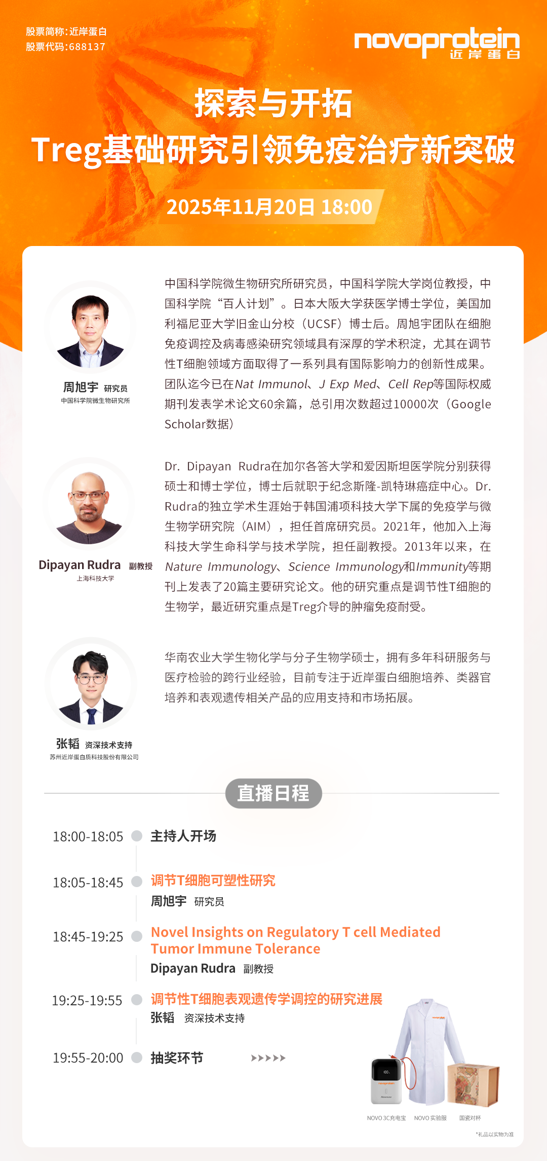 2025年11月20日18:00,近岸蛋白主办的“探索与开拓:Treg基础研究引领免疫治疗新突破”线上论坛成功举办。本次论坛特邀两位Treg研究领域的学者——中国科学院微生物研究所周旭宇研究员和上海科技大学Dr. Dipayan Rudra分享他们在调节性T细胞研究中的突破性发现。